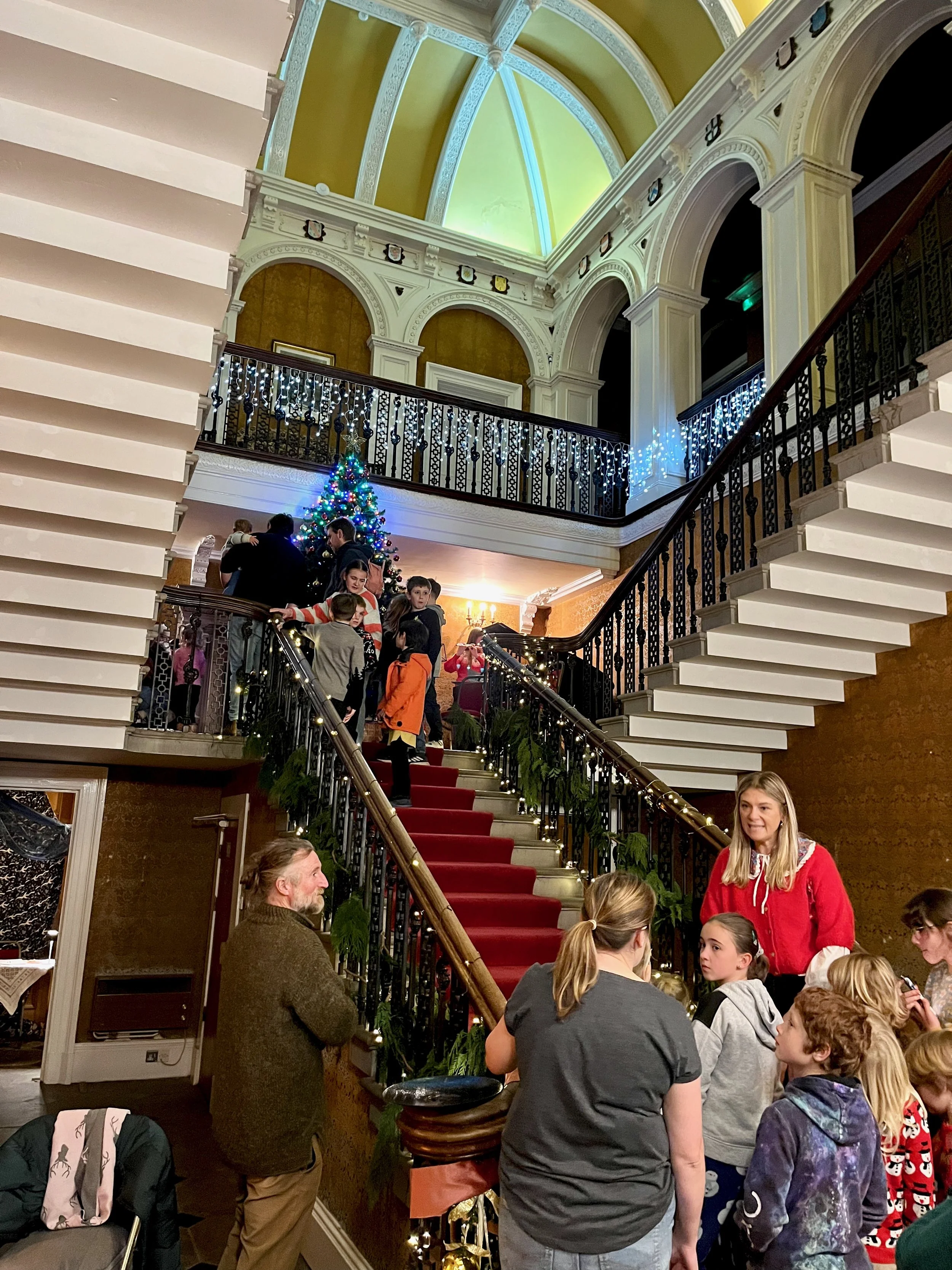 This festive evening was held in Baskerville Hall in Clyro. (Yes, it just might be THAT Baskerville Hall of Sherlock Holmes’ literary fame. Possibly.) We had not been to Baskerville Hall yet, though you can see it from various points around Hay. Clyro is a walkable town just over the Hay bridge. Clyro is most famous for its English clergyman Francis Kilvert who lived and wrote there and often walked the short way to Hay-on-Wye. It is a lovely walk from Hay to Clyro, with gorgeous views of the mountains. I was rushing to get there and set up on time so this photo late in the evening rush to see Father Christmas was all that I got. I was at my table the rest of the evening.