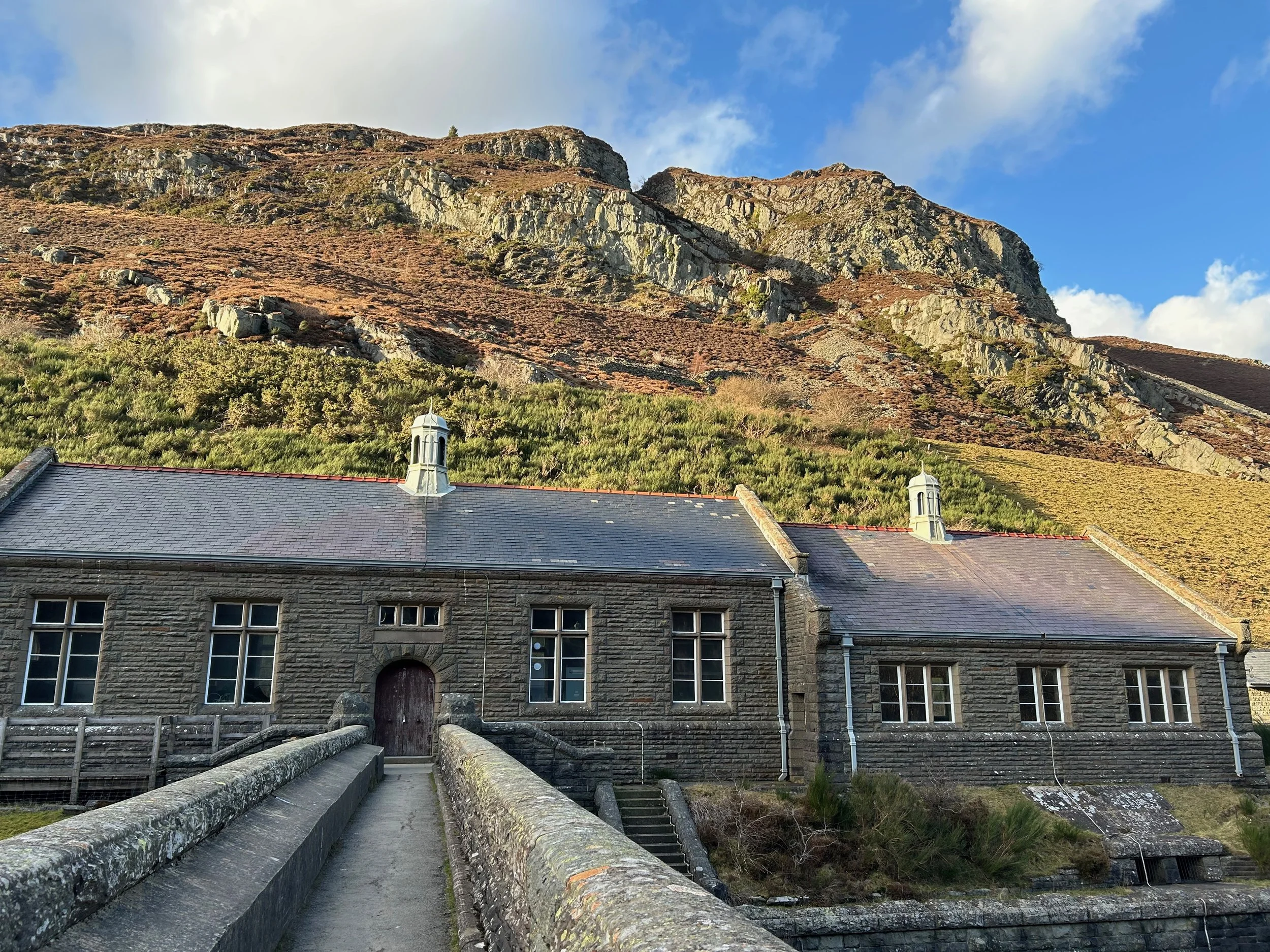 One of the identical stone buildings on either side of the dam that house electricity generating turbines and valves and sluices to adjust the amount of compensation water released downstream. Shockingly beautiful buildings.