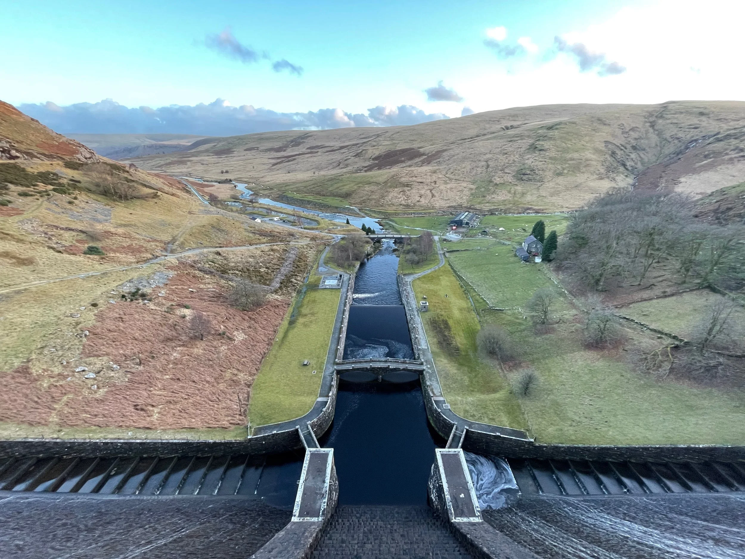 View at the center of the Claerwen Dam. It is the highest at 56m.