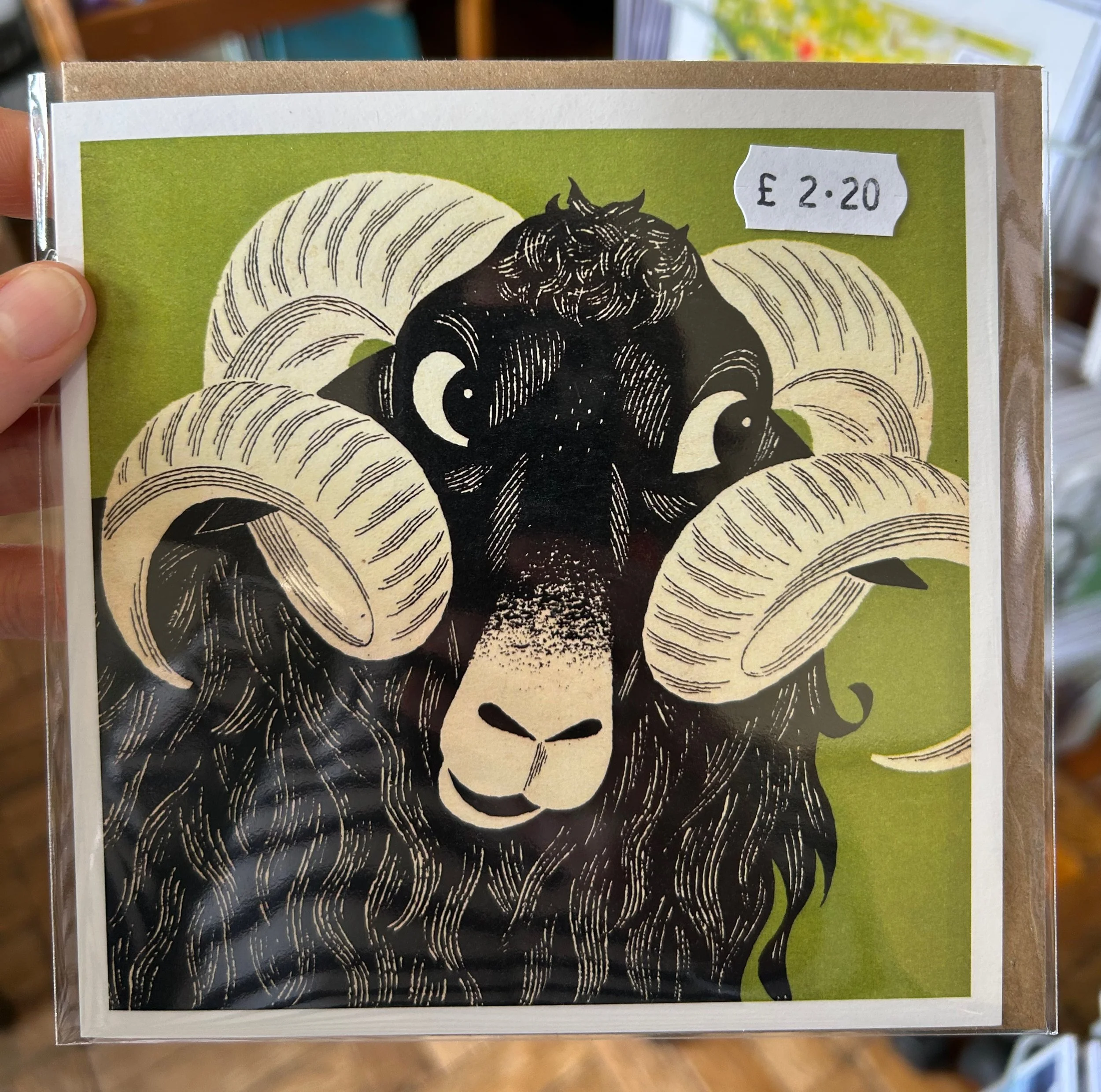 Strikingly hilarious illustration of a sheep on a card in a bookshop. It was the cover for Country Fair Magazine in 1954 and was created by John Hanna.