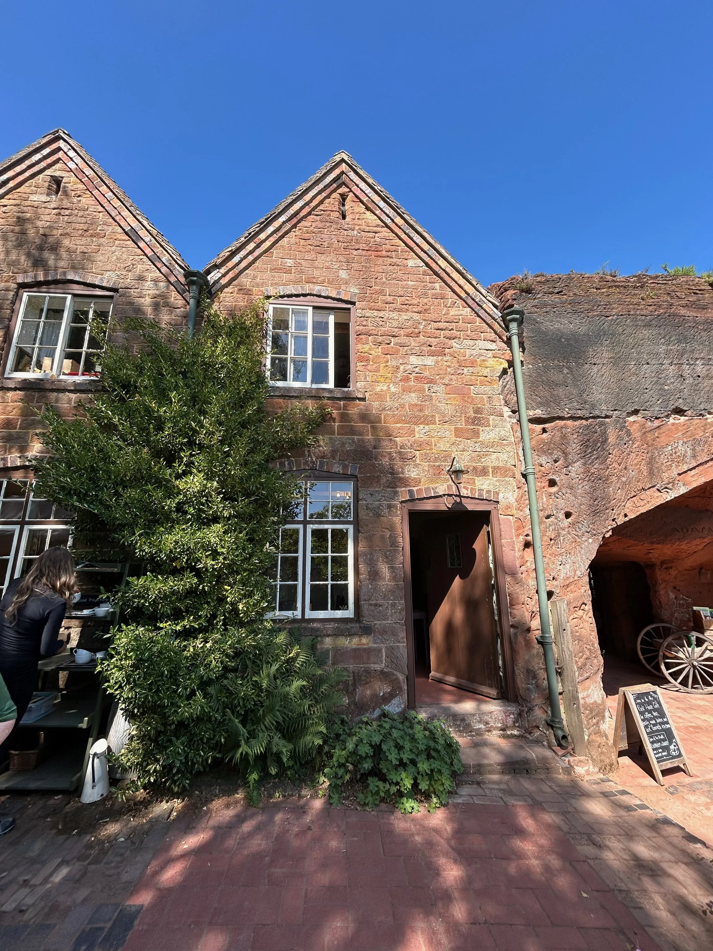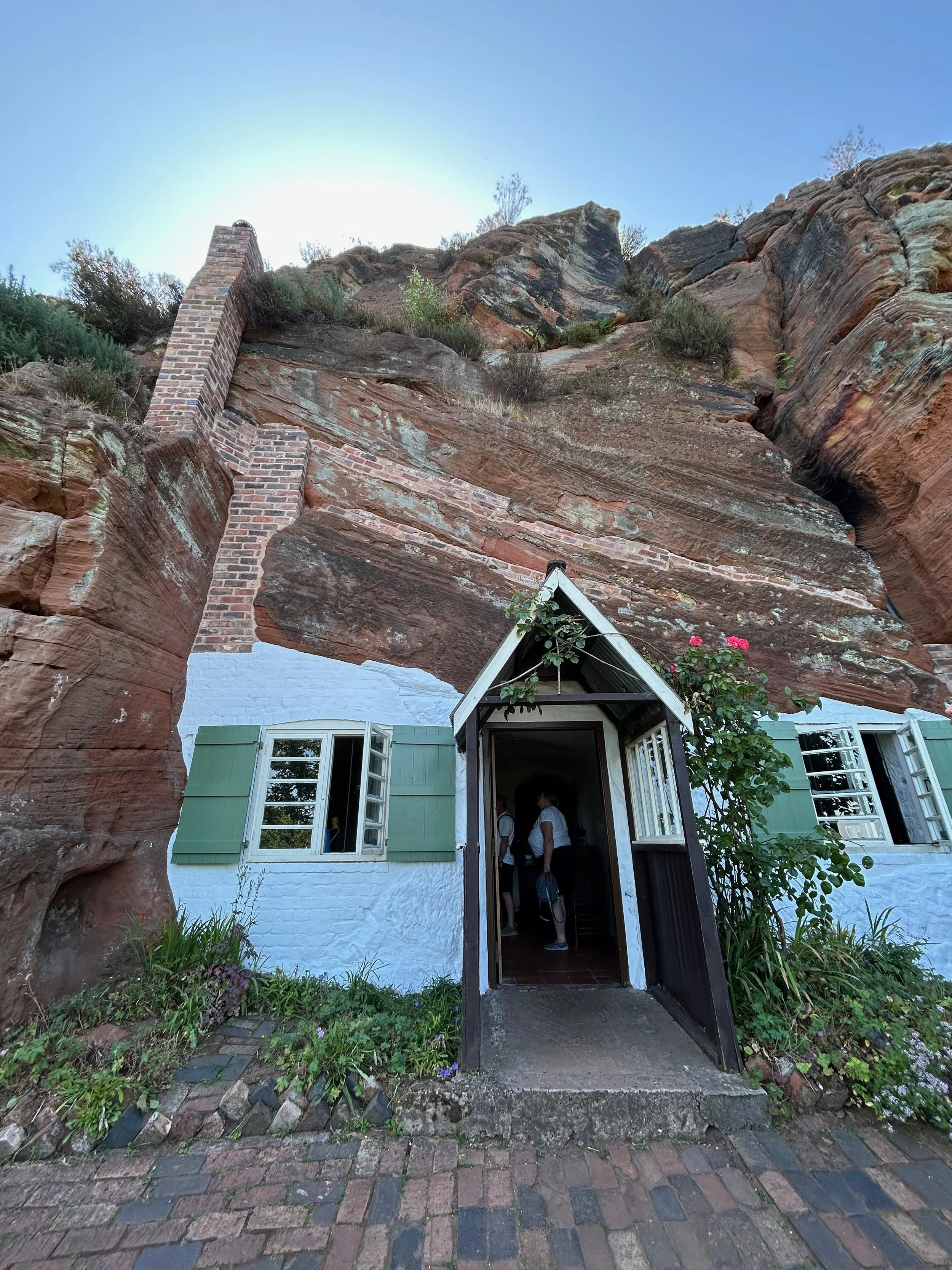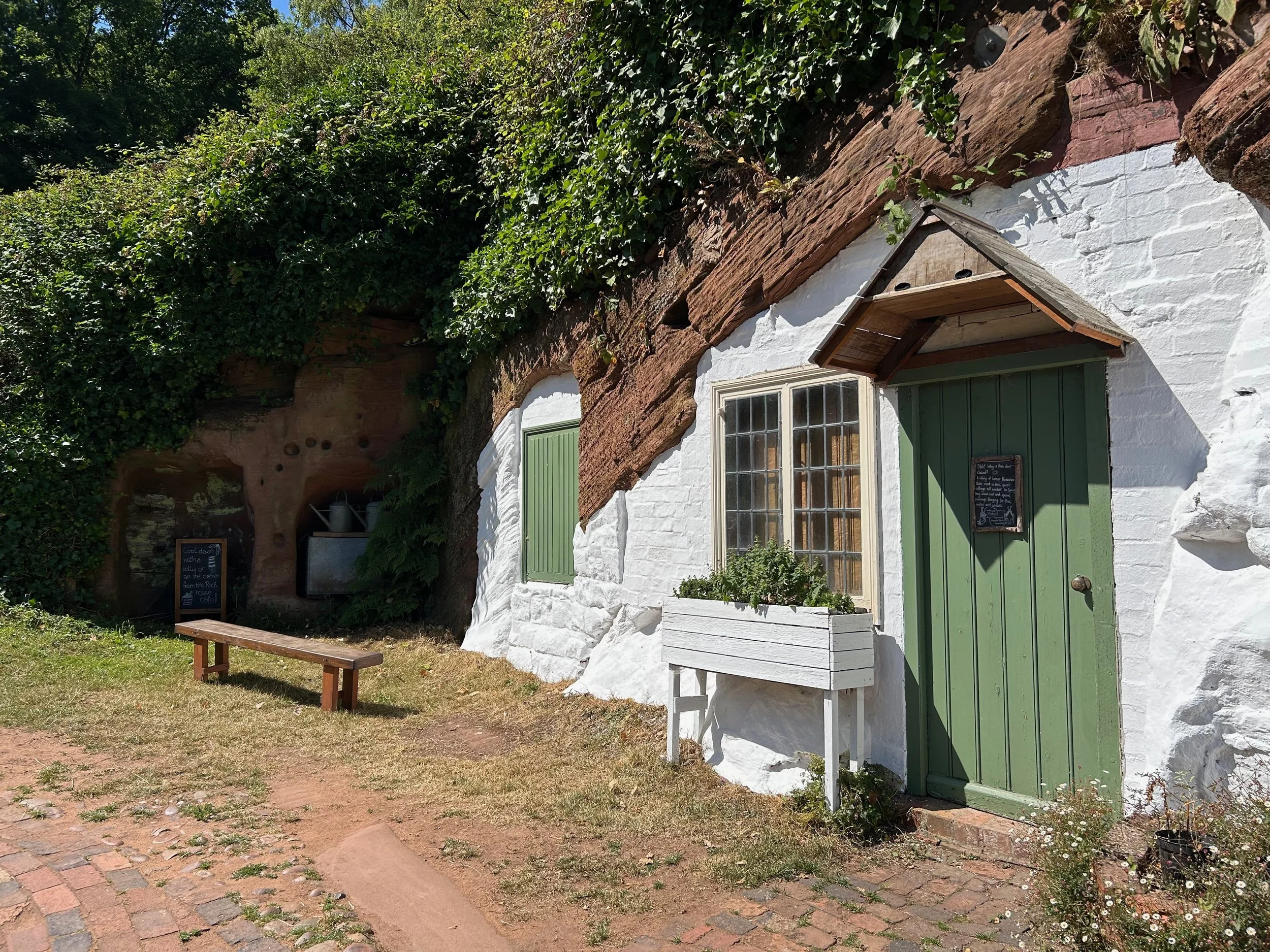 The upper level has been restored into a tea room. In the early 1900s, there was a very popular tramway taking visitors to surrounding towns. The Rock Houses residents took the opportunity to make money and served tea as a stop along the way. It is quite the jarring full house on top of the other Rock Houses, but an interesting piece of the history and a nice spot for refreshment after walking up the Kinver Edge trail. Especially with unrestored cave rooms right next door!