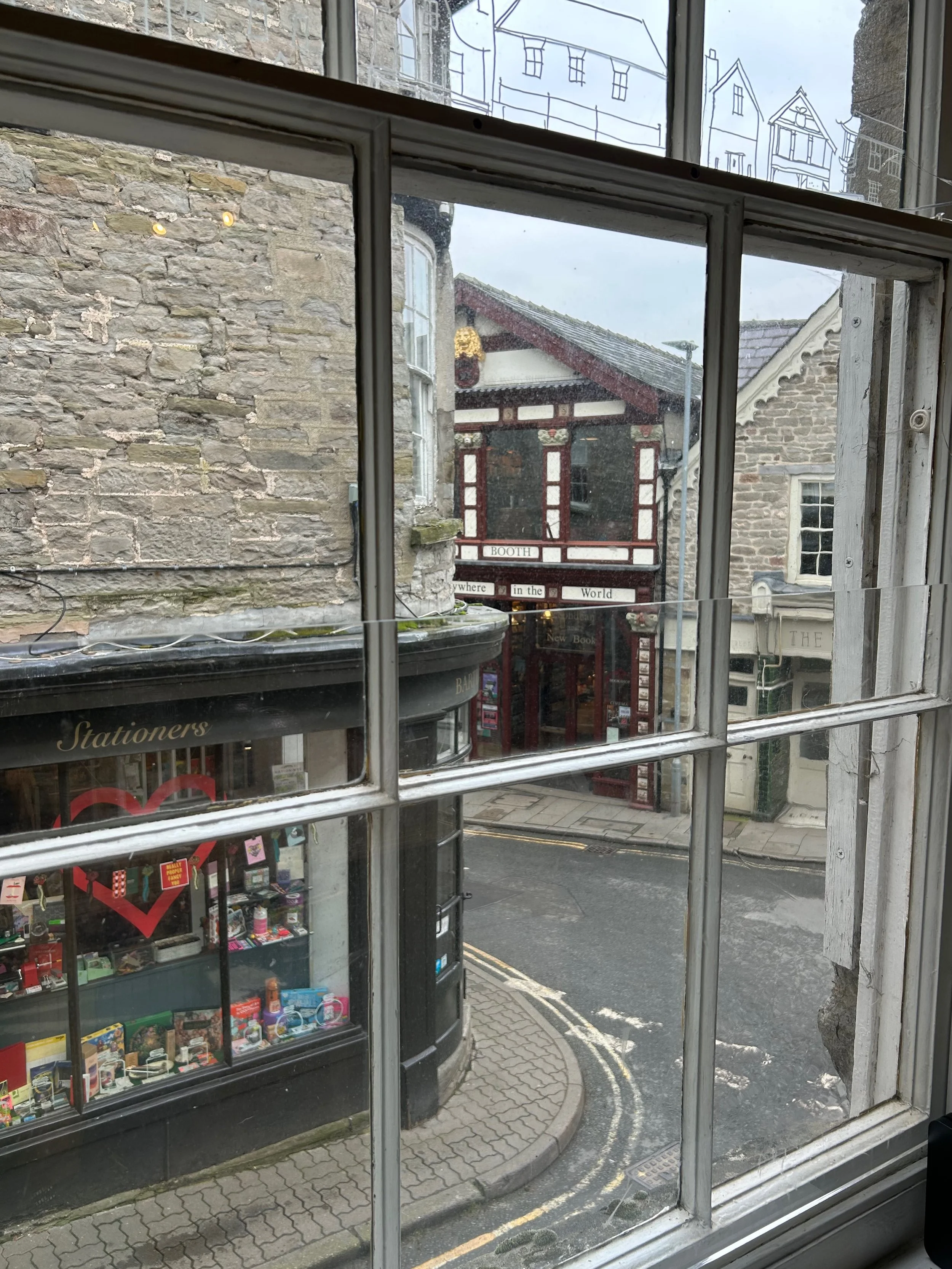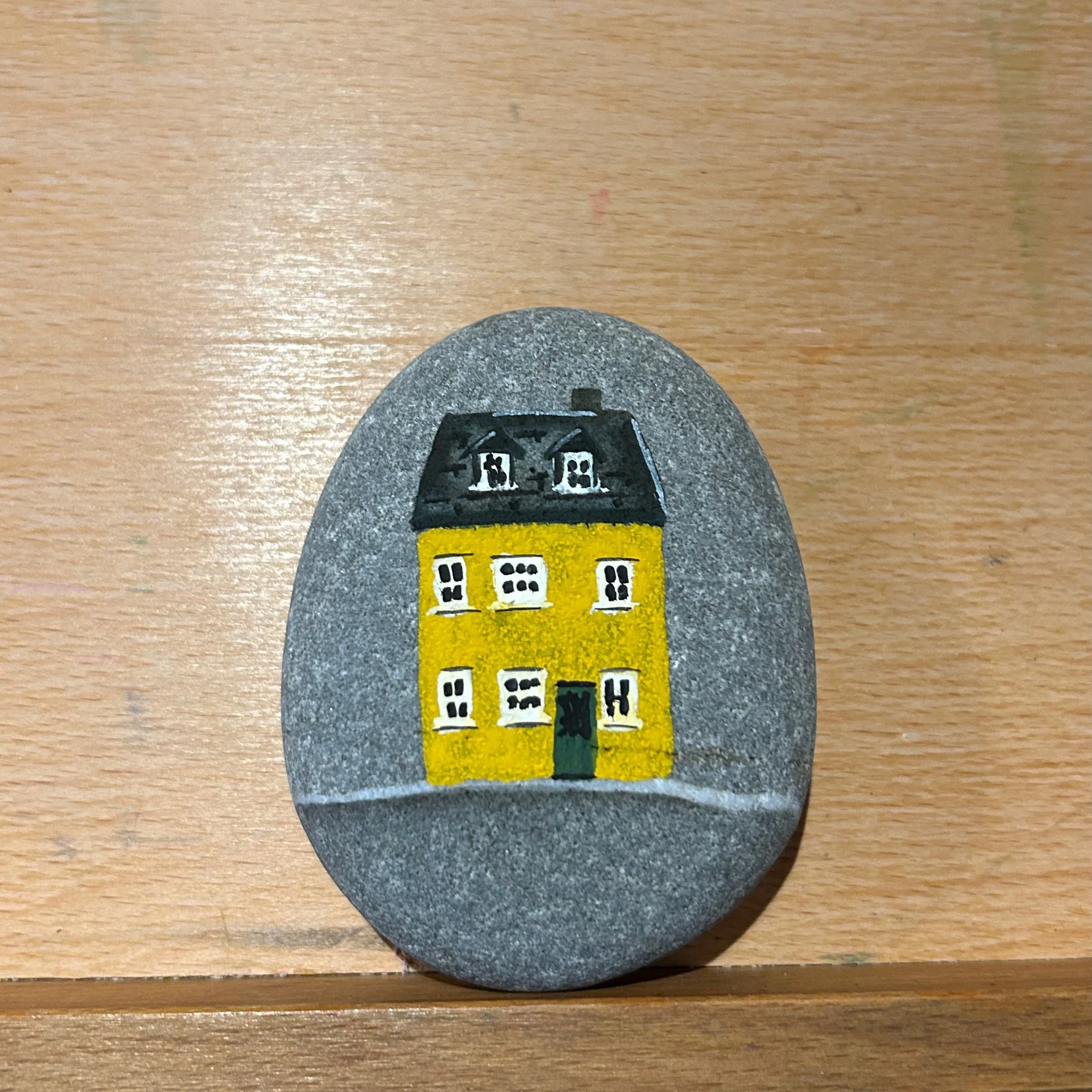 The rock I was painting in the above photo. We went to Tenby in Pembrokeshire Wales back in September for my birthday. While walking along one of the beaches, I found this rock which I just loved. The shape and smoothness of it were delightful, but the most inspiring part was the white line that ran across it. Apparently it is made by some minerals that seep into the cracks and crystallize as the water evaporates. I thought this particular one looked like a horizon line and I envisioned painting a colorful house on it like the ones around the beach. The rock has been sitting on my desk for months and I finally picked it up this week to try. I actually patterned the house after a favorite cottage here in Hay, but I rather like the yellow and gray combo. The windows turned out quite poorly, but it was a fun first try. I might have to paint some more sometime!