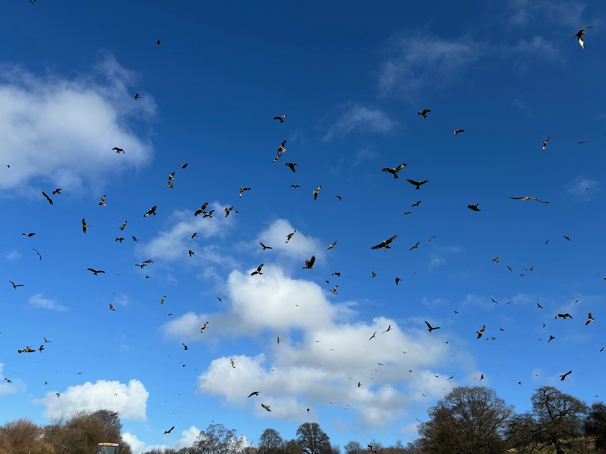 At 2pm, a tractor arrives with a load of feed that the farmer throws with a huge shovel into various spots around the land. It lasted about 45 minutes watching the Red Kites swoop down to collect their feed.